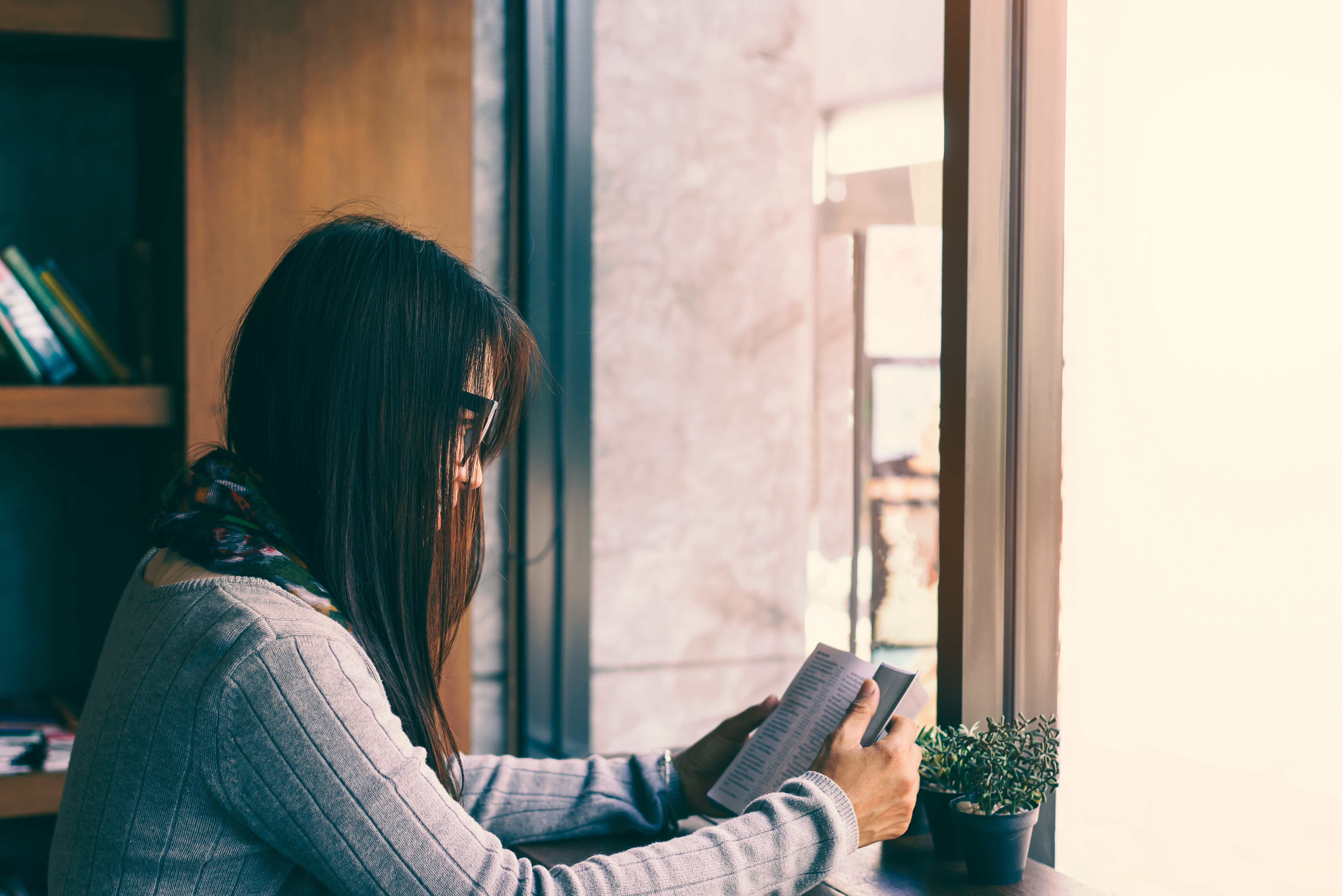 Girl reading the Bible in the library cafe.