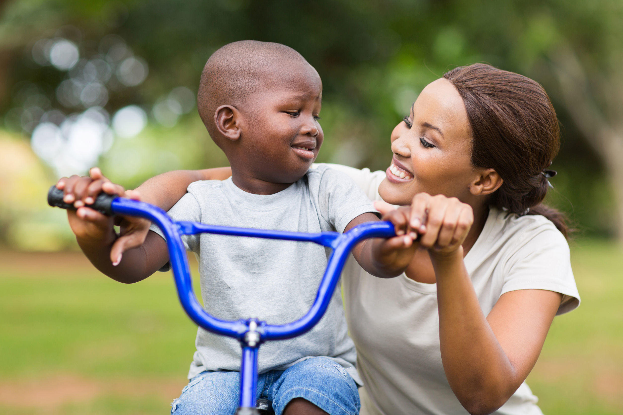 black woman helping her son with bike